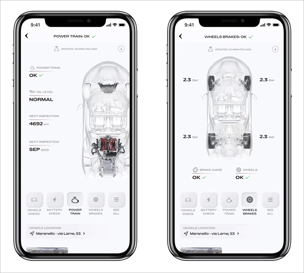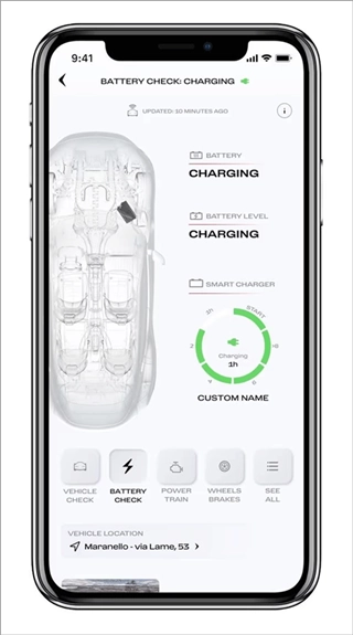 2、在"我的车库"部分中,您还可以找到有关任何潜在问题的警报、法拉利Manettino的状态、灯光、传感器和液位以及发动机、制动系统和高压电池(如果您的汽车是混合动力插电式汽车))。您还可以密切关注汽车的里程表及其最后已知位置,这将是您汽车发动机最后关闭的位置。