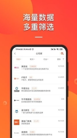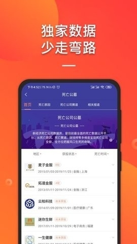 2、对中国独角兽列表、千里马列表、死亡公司列表等进行动态更新,用户能够一键查看特定类型的信息。