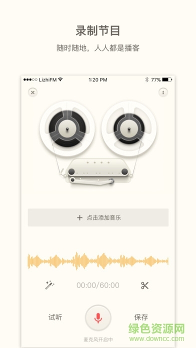 强大录制节目功能——可录制长达60分钟节目,可添加多首音乐随时切换播放,自动混音,降噪无需再进行后期剪辑