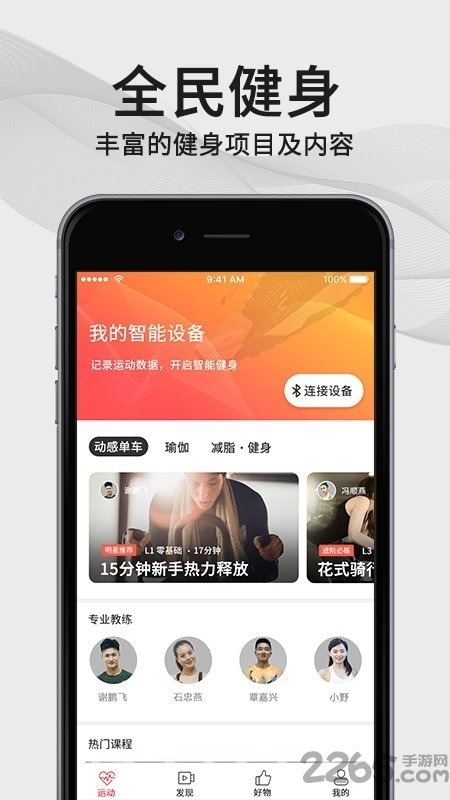 、瑜伽、减脂、力量等多个类型的专业课程,由知名教练精心制作,覆盖零基础、初级、中级、高级等各种级别与强度的课程