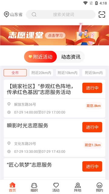 3、可以在页面底部将导航栏切换至【活动】,在打开的页面中可以看到最新的志愿活动,以及附近的志愿活动