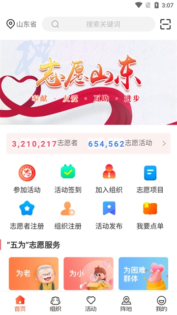 2、进入首页点击【五为志愿服务】专栏里的“五为”志愿服务活动,可以参加社会急需的志愿活动