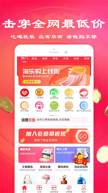 在这款软件里,用户可以买到各类实惠的商品,平台还设有新人免单、省钱攻略、赚钱技巧等福利内容,让大家在购物的同时还能获取额外收益。查找商品时,既可以通过类目直接筛选,也能在搜索框输入关键词精准查找,操作十分便捷,能为用户带来更优质的购物体验。
