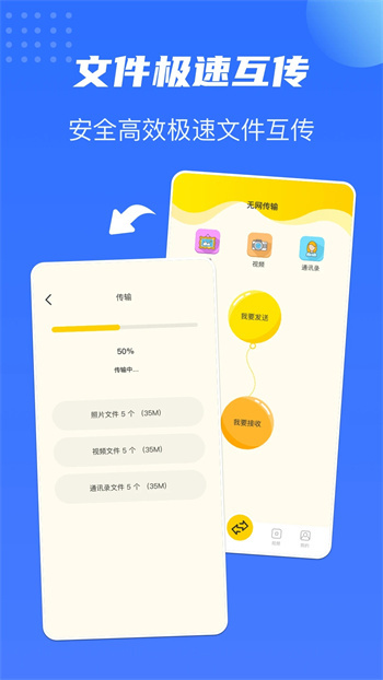 这款软件能帮助用户快速把旧手机里的数据和照片传输到新手机上。传输完成后,所有数据会按时间排序,方便用户查找;用户还可以给新手机里的文档重新命名。整个使用过程非常简单,没有任何操作难度。