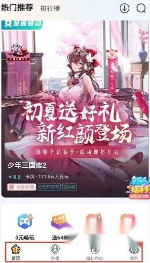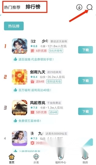 2、进入首页界面,包括热门推荐和排行榜游戏分类,用户可根据需求选择,还可以点击右上角【放大镜】图标进行游戏搜索,