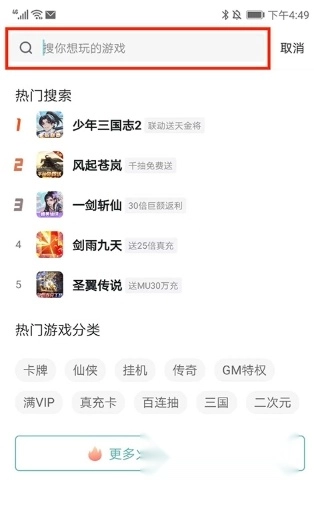 3、进入搜索界面,输入想玩的游戏名称即可,也可以在下方热门搜索和热门游戏分类中进行查找,这里以少年三国志2为例,
