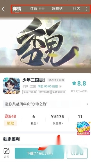 4、进入游戏详情界面,包括评论、攻略、社区以及游戏相关的介绍,还能够领取礼包和代金券等福利,点击下方【】即可进行,