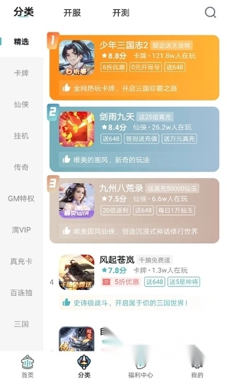 5、进入分类界面,包括卡牌、仙侠、挂机、传奇、开服和开测等游戏类型,用户可自行选择,