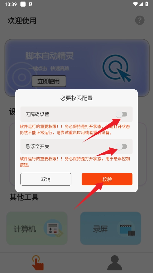 2、然后将必要的【无障碍设置】和【悬浮窗开关】的两个控制按钮开启。然后点击【校验】校验通过,表示开启成功。
