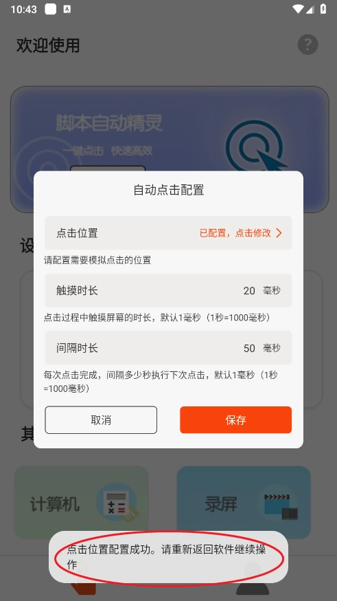 5、当提示点击位置配置成功之后,就可以返回软件使用了。