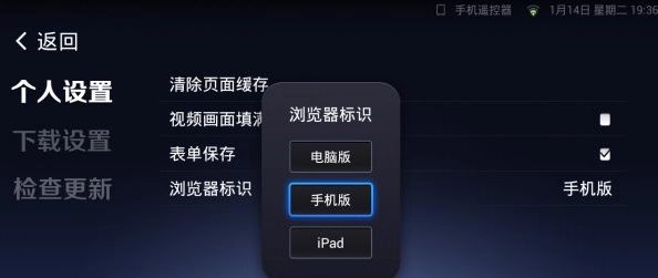 5、在设置与工具>>设置>>个人设置里,可以修改浏览器标识为手机版、电脑版、iPad版