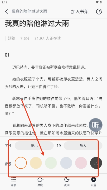 5、在这里还可以选择不同的阅读方式,听书,自动翻页,还有调整背景颜色等功能。