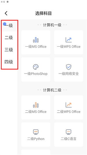 2、用户需要选择一门科目,也可以根据级别难度选择。