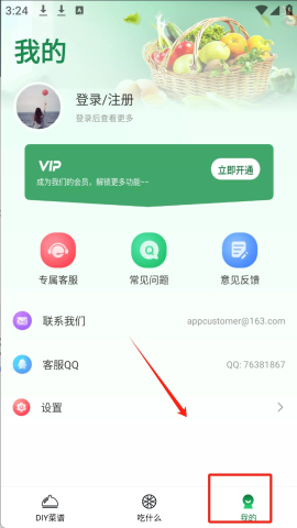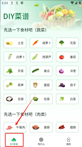 1、点击“DIY菜谱”可以选择所需的蔬菜或肉类食材。