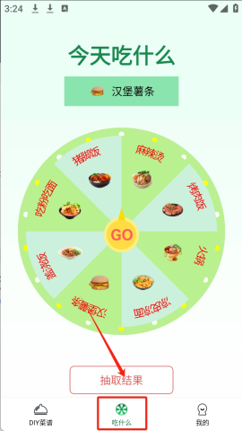 2、再次点击“吃什么”,便能选择菜品并生成推荐结果。