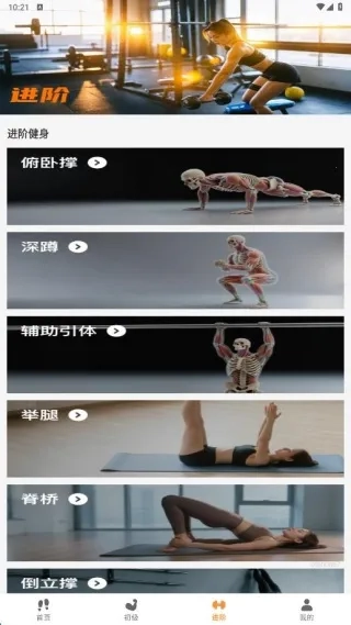 3、在进阶页面,则呈现了俯卧撑、深蹲等难度系数高的运动方法。