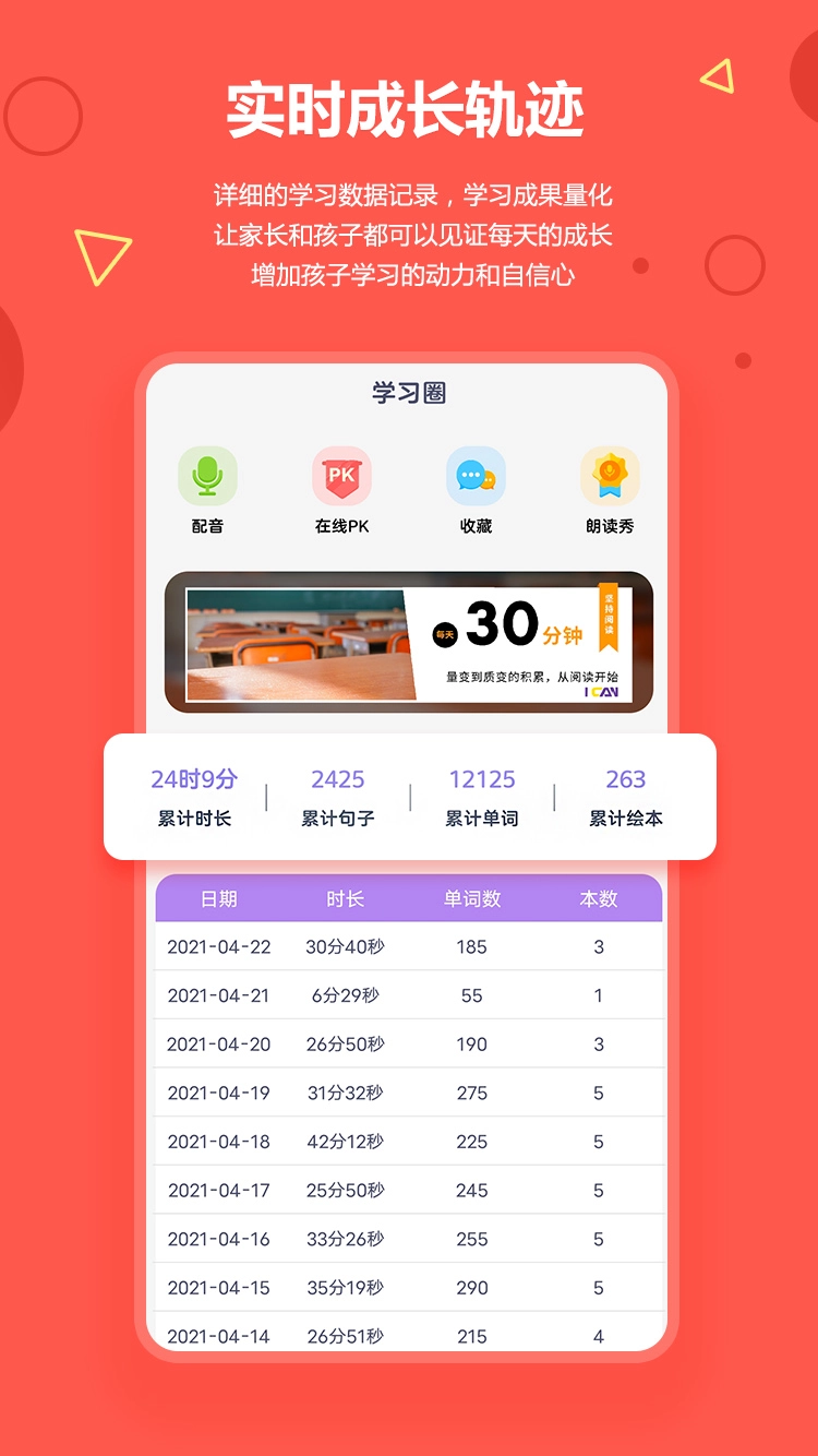 通过对孩子的英语基础、学习行为、朗读打分、错误数据进行智能分析,推送适合每个孩子的英语学习资料,为每一位孩子系统的、科学的、有效的定制适合自己的学习材料。