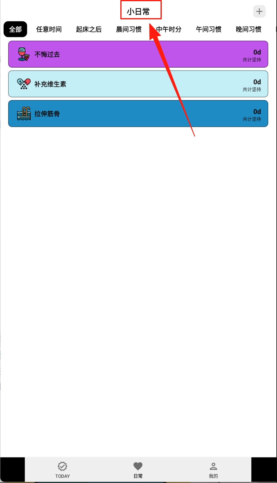 1、打开小日常应用,在首页点击右下角的加号按钮,挑选你想要培养的习惯,像喝水、早睡这类都可以,接着设置好对应的提醒时间,之后每天完成该习惯的打卡操作就可以了。
