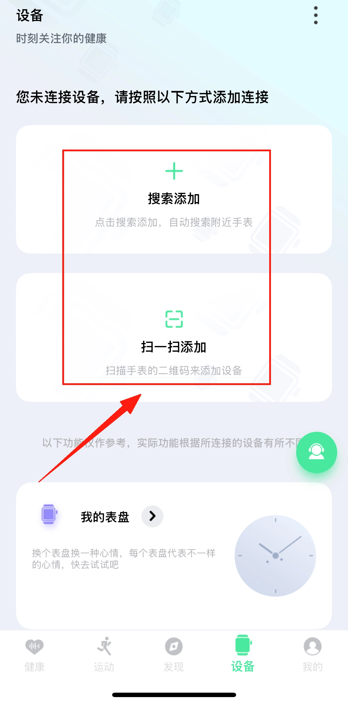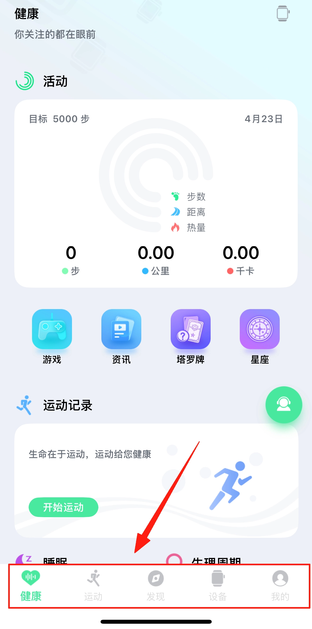 1、首先打开这款软件,我们会默认进入健康界面,点击底部的设备按钮就能跳转到设备界面。
