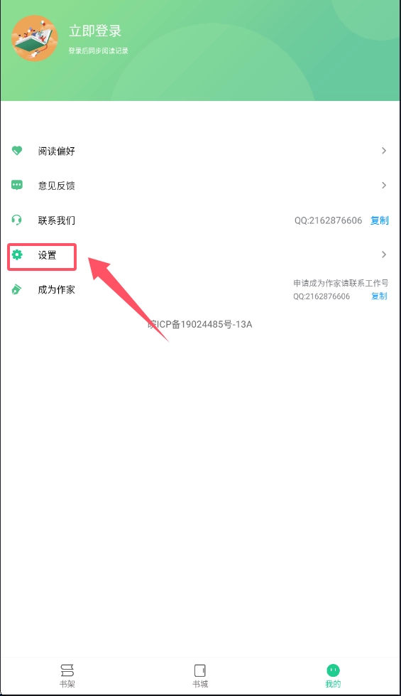 4、个性化设置可在我的页面完成,记得先点击立即登录来同步阅读记录。在这里你可以设置阅读偏好、反馈意见或通过QQ联系客服。