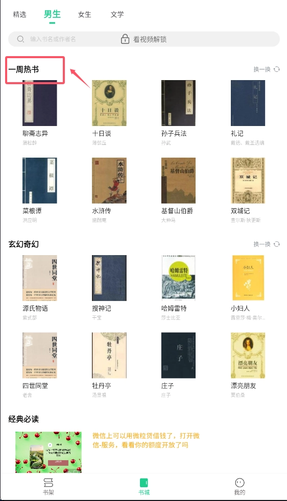 2、浏览书城时,书籍以封面网格形式呈现,像一周热书、玄幻奇幻等栏目都很直观。