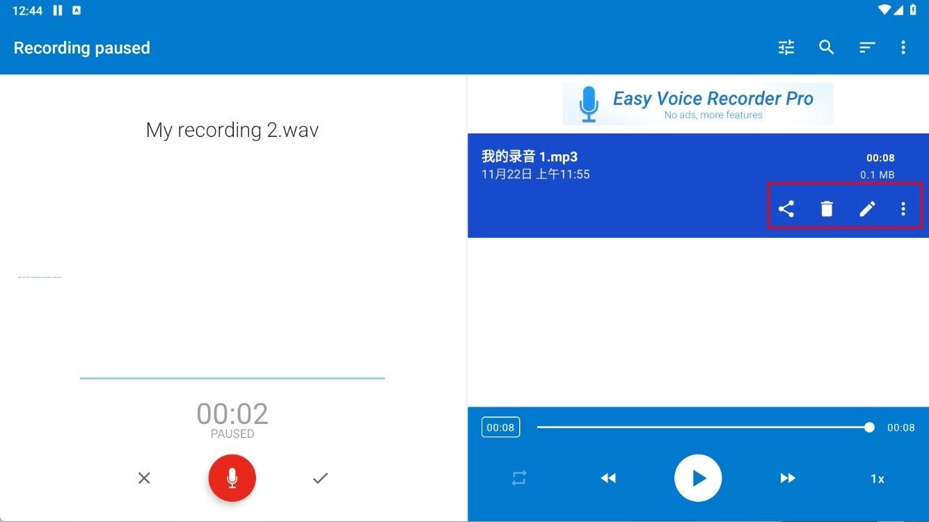 4、选中【我的录音1.mp3】,使用右侧【分享】-【删除】-【编辑】快捷图标,快速完成操作提升效率。