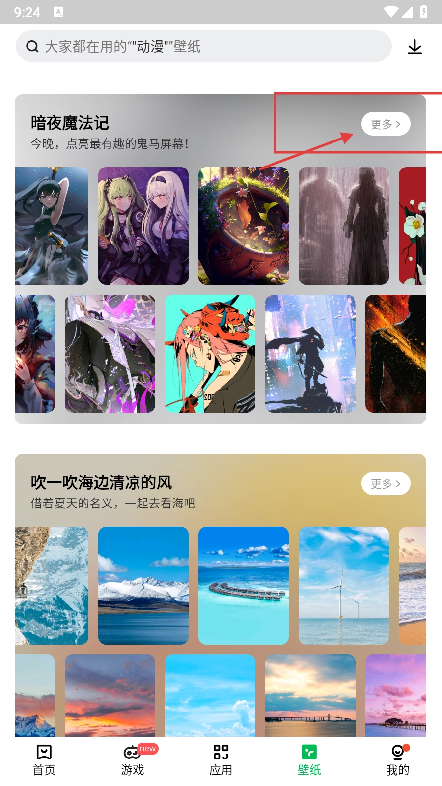 2、在壁纸页面,找到【暗夜魔法记】板块,点击其右侧【更多】,进入该壁纸系列详情页面。
