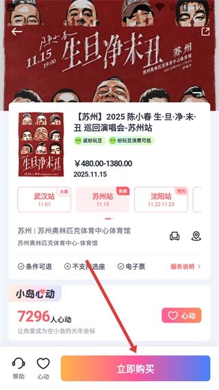 4、在演唱会详情页,点击“立即购买”,可进行购票操作,还可查看服务说明、标记心动等。