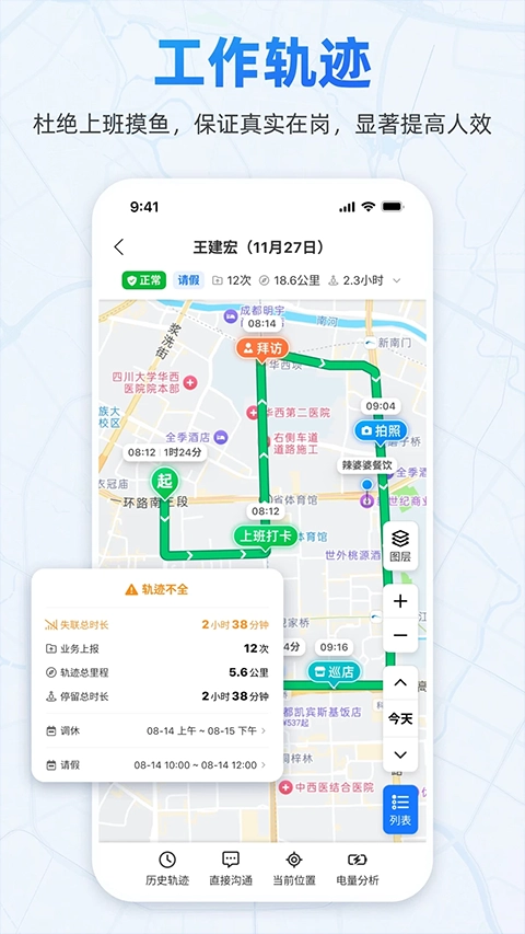 3、数据统计:提供了丰富的数据统计功能,包括员工任务完成情况、工作时长、行程轨迹等,帮助管理员全面了解团队的工作状况和业绩情况。
