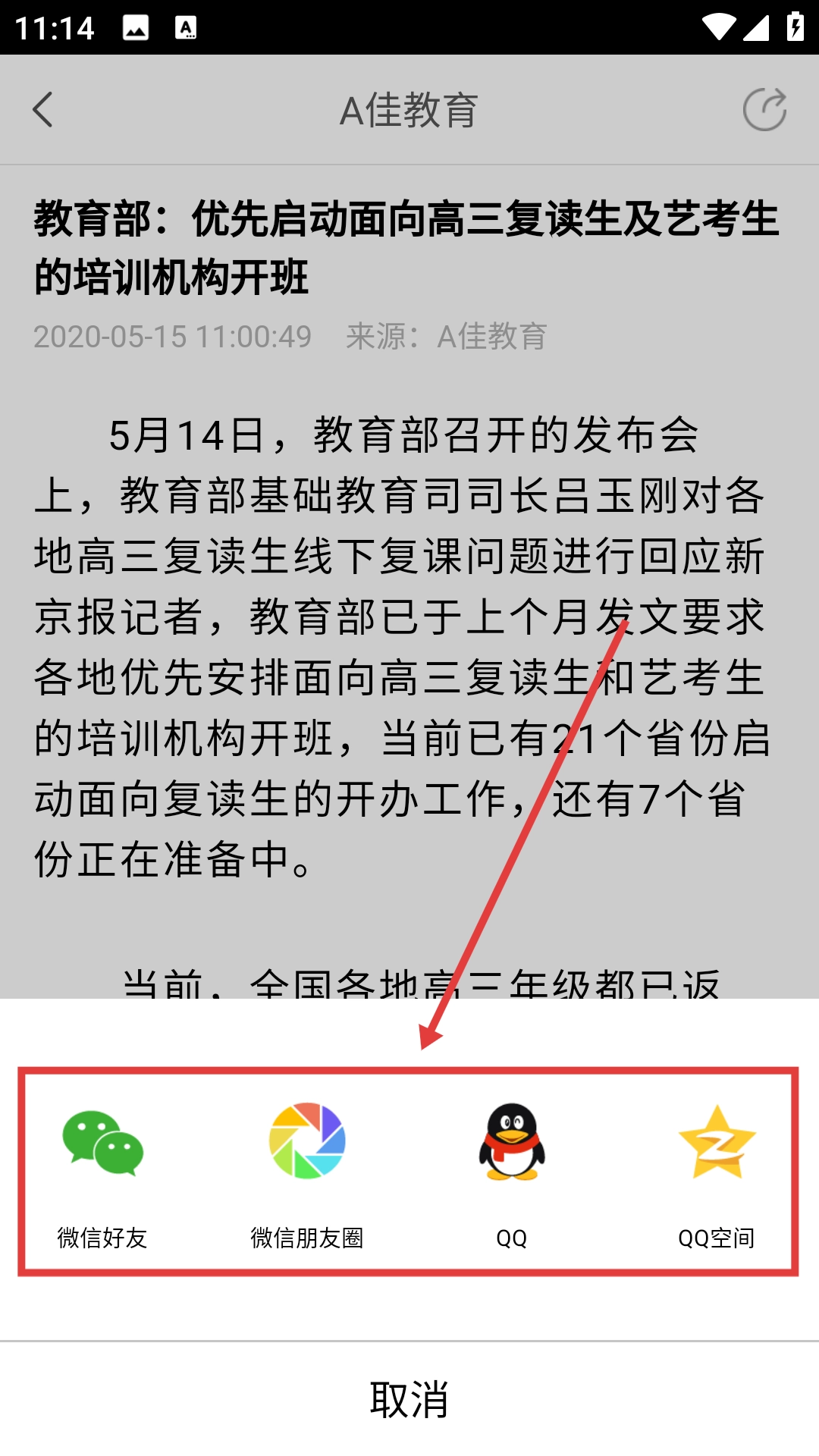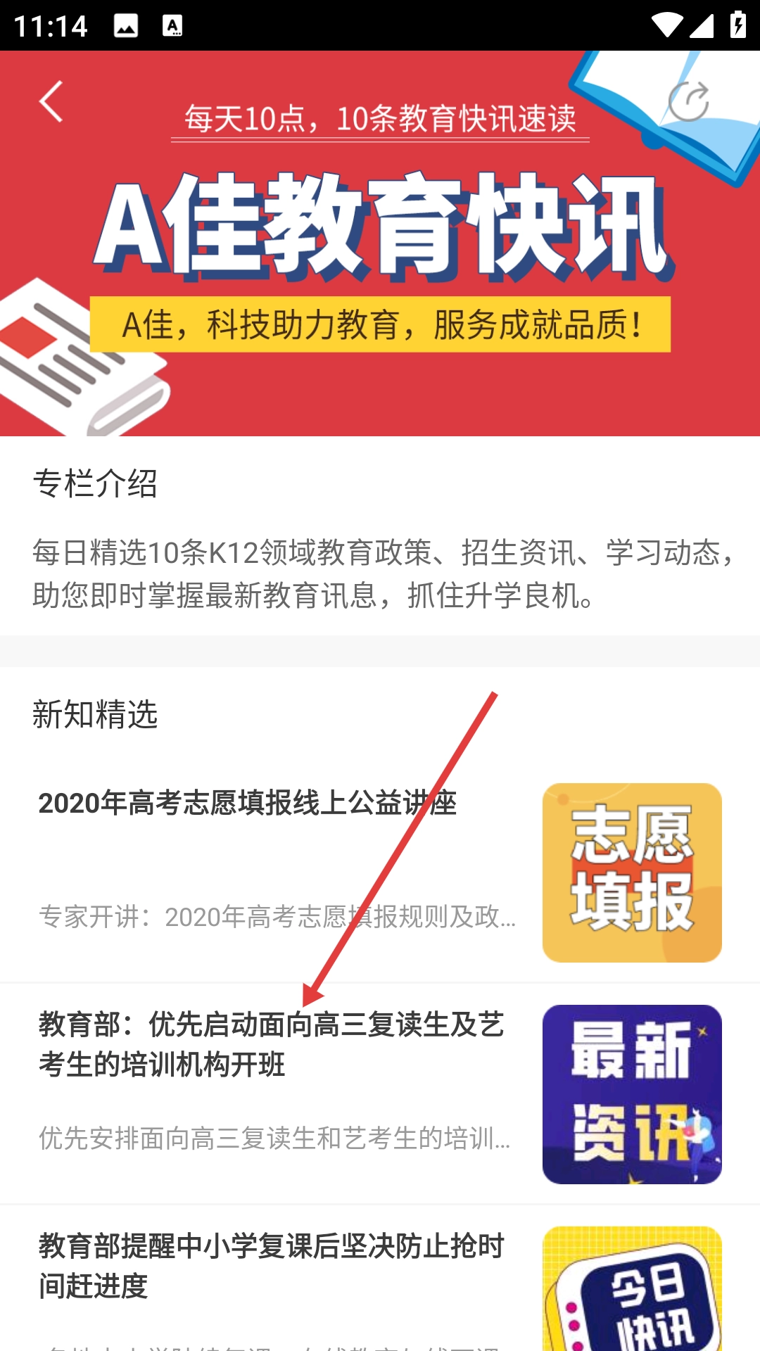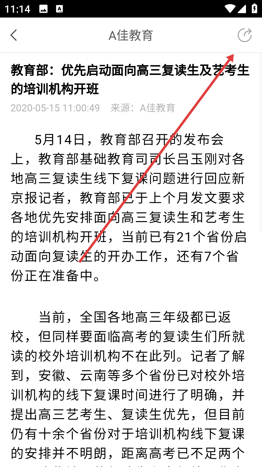 2、在A佳教育快讯页面,点击目标新闻(如“教育部:优先启动面向高三复读生及艺考生的培训机构开班”),进入新闻详情页。