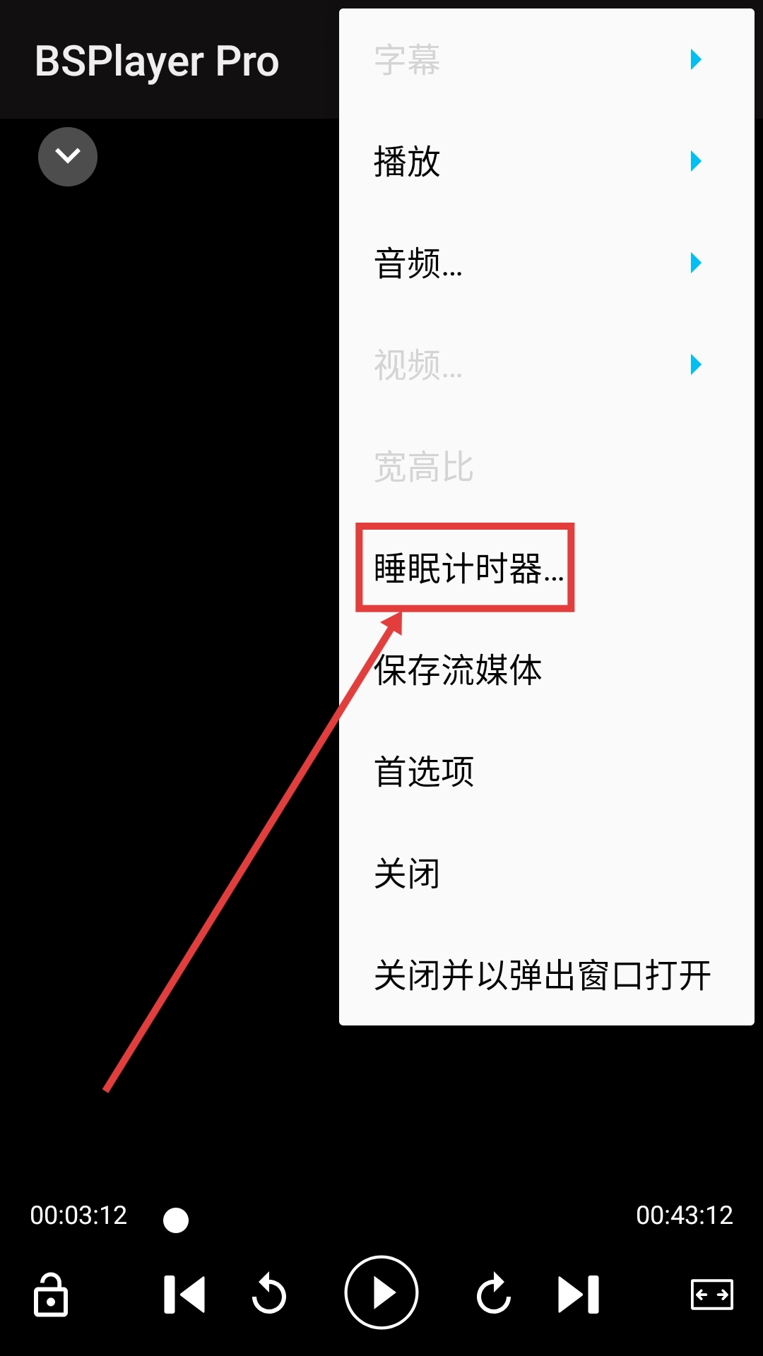 3、在【BSPlayer-Pro】功能菜单中,选择【睡眠计时器...】,进入睡眠计时器设置页面。