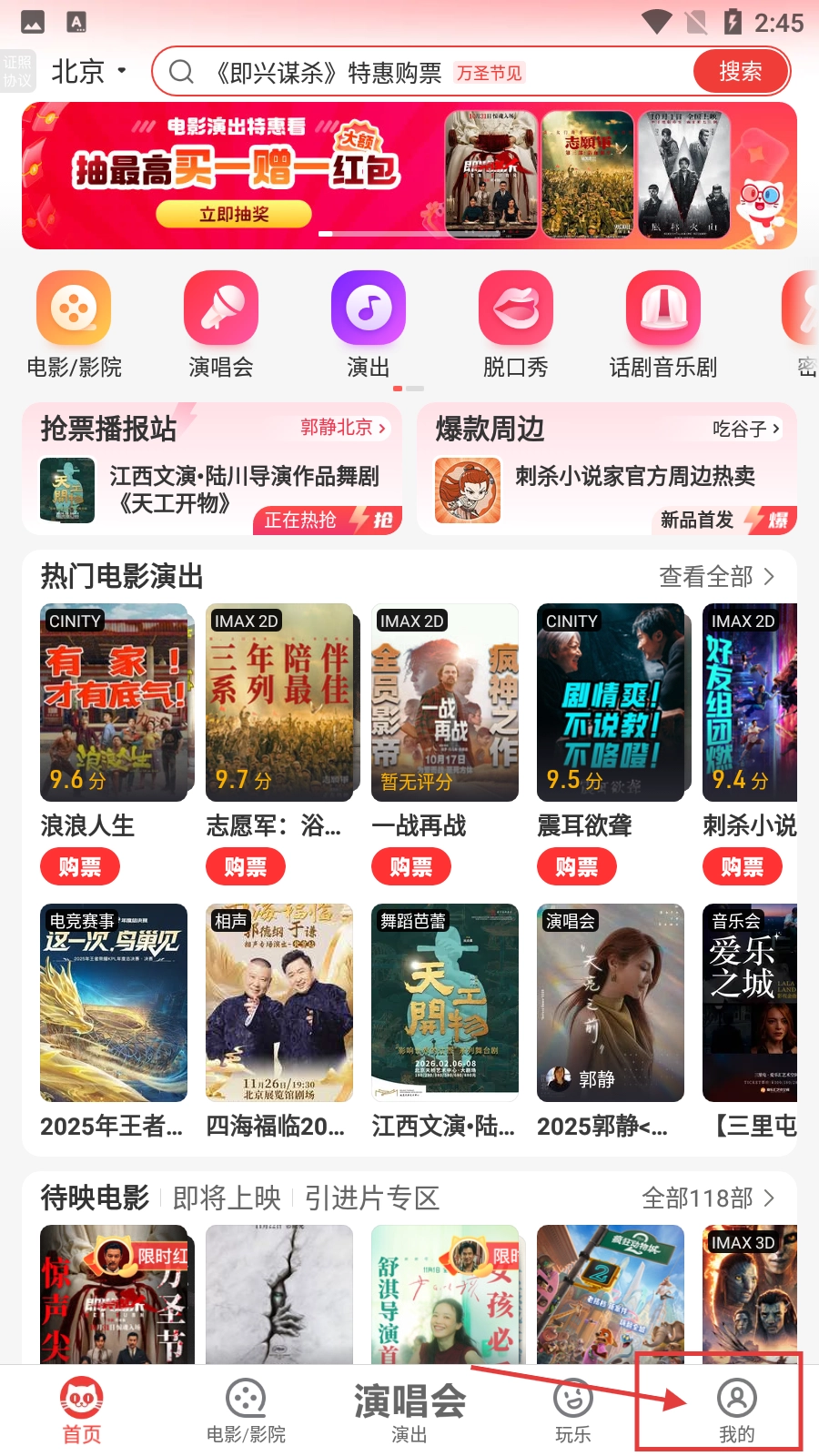 1、打开该票务软件后,在首页底部找到【我的】按钮并点击,即可进入个人中心界面。