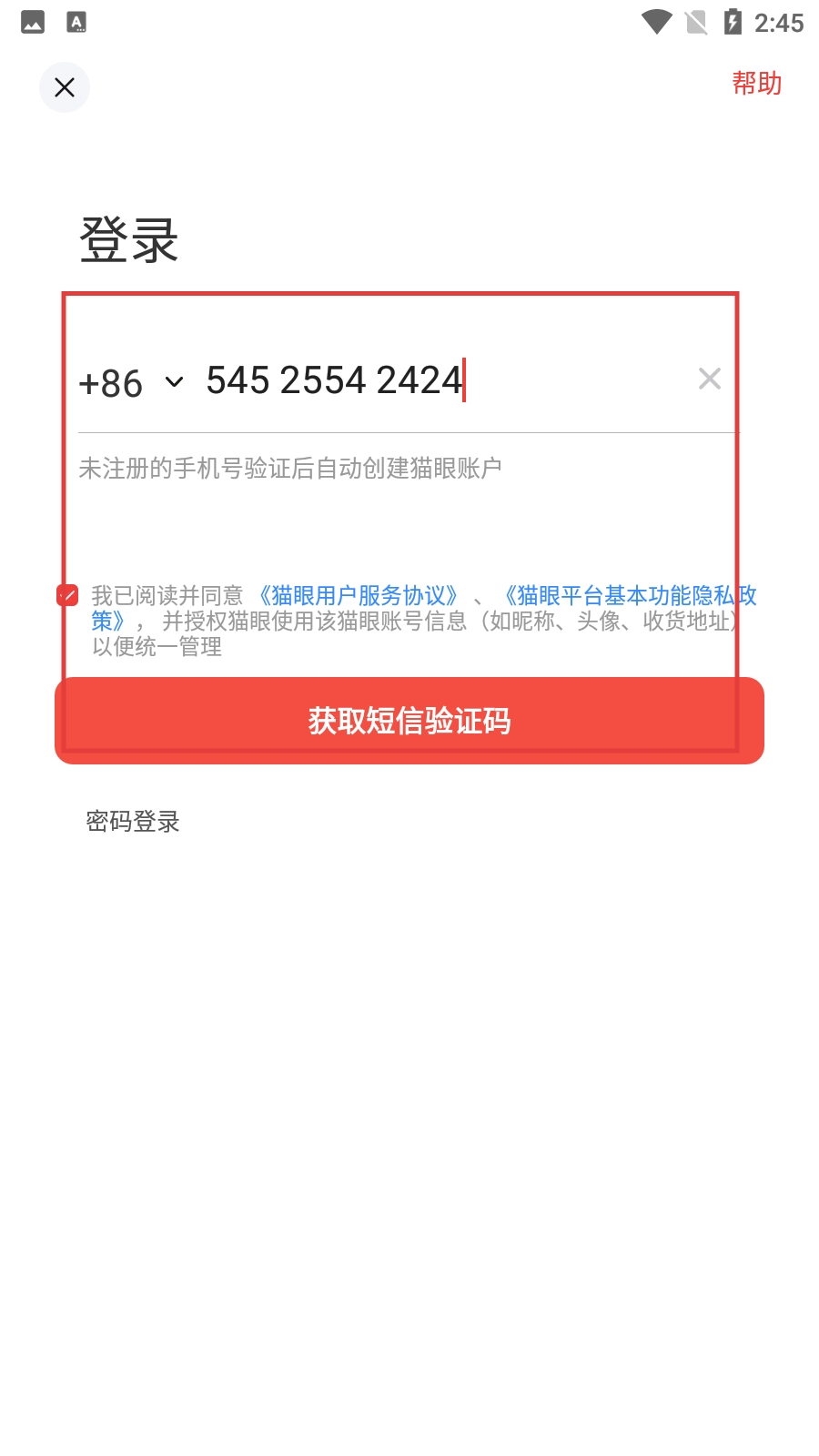 3、在登录界面,输入手机号并勾选协议,点击【获取短信验证码】准备登录。