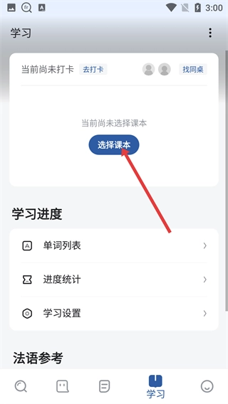 1、在主界面点击底部的【学习】按钮,即可进入学习页面,在该页面能查看学习打卡等功能;若当前还未选择课本,则需要点击“选择课本”来完成相关操作。