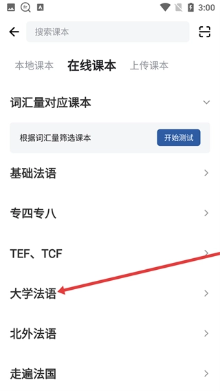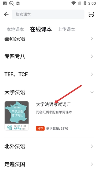 4、选择【大学法语考试词汇】课本,该课本为同名纸质书配套单词课本,包含3170个单词,可用于大学法语考试词汇的学习。