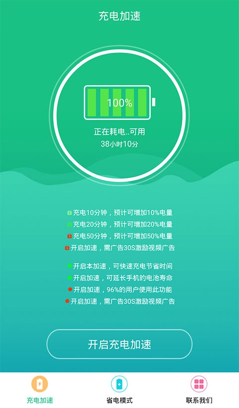 1、在手机充电加速器的首页找到并点击【充电加速】按钮,即可进入充电加速功能对应的页面。