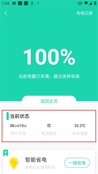 4、进入充电记录页面,可查看当前电量及设备状态等信息。