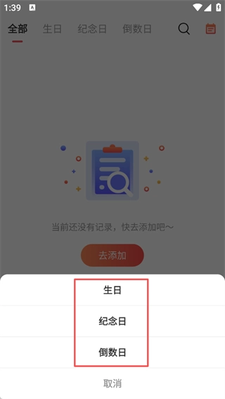 2、添加类型提供【生日、纪念日、倒数日】三种分类,用户可按日期类型选择,精准记录不同意义的日期。