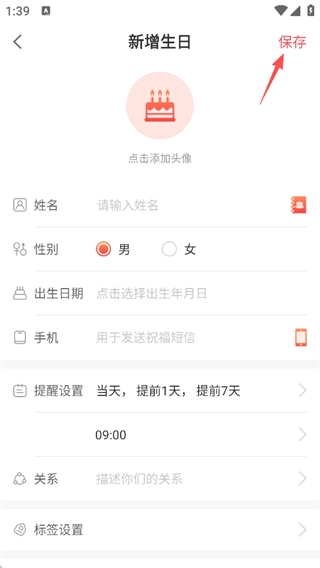 3、填写姓名、性别、出生日期等信息,设置提醒时间与关系,点击【保存】即可完成生日记录。