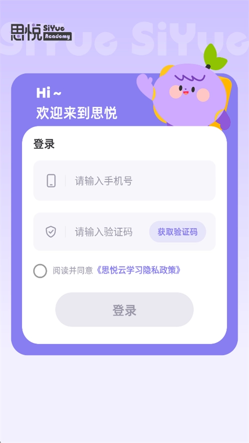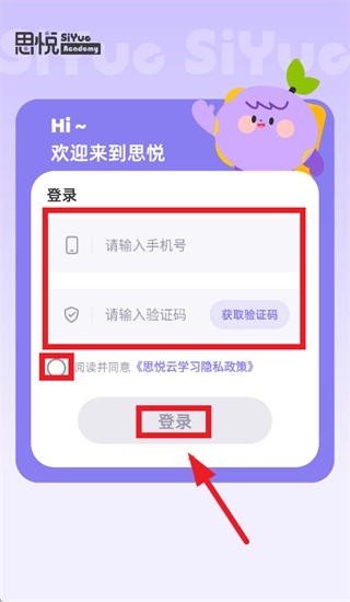 进入登录界面后,先输入手机号和验证码,接着勾选“阅读并同意《思悦云学习隐私政策》”,最后点击登录按钮就能完成登录操作。