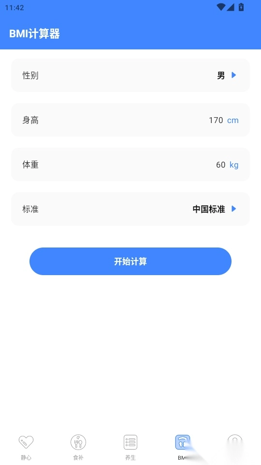 3.进入到“BMI计算器”页面中选择性别输入身高、体重数值后点击“开始计算”