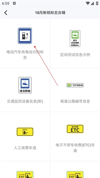 3、在新规标志合辑列表里,点击目标标志(如【电动汽车充电站识别标志】),进入详情页。