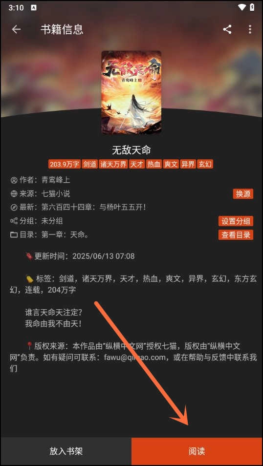 1、选择一本小说并进入其详情页面,准备进行书源切换以获得更优阅读体验。