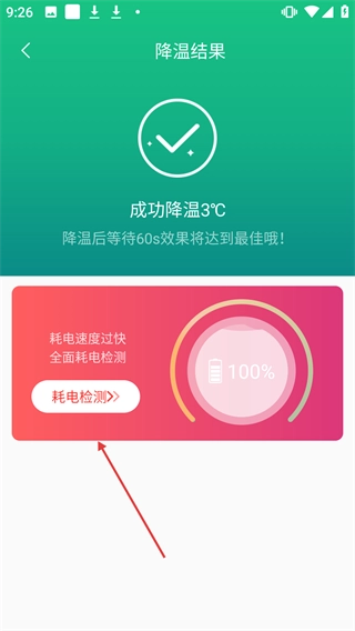 3、降温完成后,若提示【耗电速度过快全面耗电检测】,可点击【耗电检测】按钮进行耗电检测。
