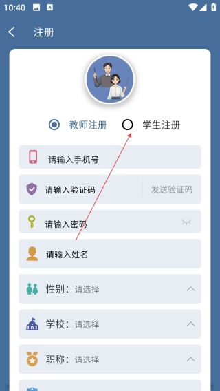 2、在注册界面,选择【学生注册】选项,切换到学生账号的注册信息填写页。