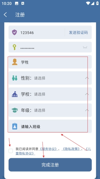 4、【补充性别、学校等信息】后勾选【协议】,点击【完成注册】提交注册信息,即可完成学生注册操作。