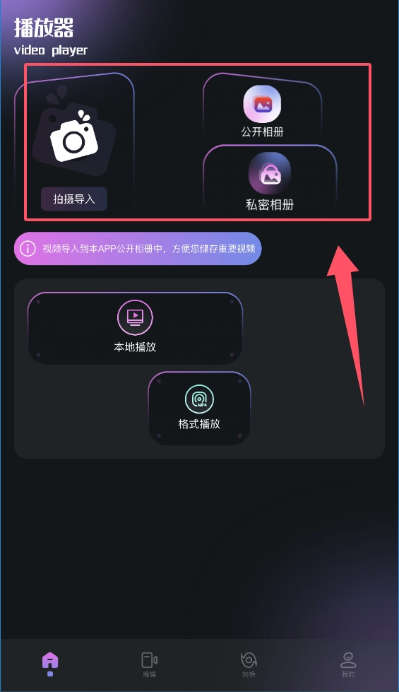 在首页,视频管理是核心功能,用户可通过“拍摄导入”功能获取视频,并将其妥善保存至“公开相册”或“私密相册”中。