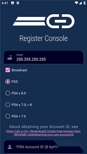您需要确保PS主机和目标设备均已接入互联网。并正确安装应用程序。获取并填写PSN账户ID与相应的PIN码。在应用中完成设备注册流程。