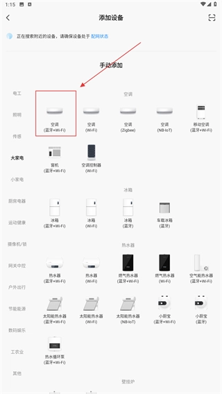 3、在“大家电”分类下,选择目标设备(如“空调(蓝牙+Wi-Fi)”),进入该设备的配网流程。