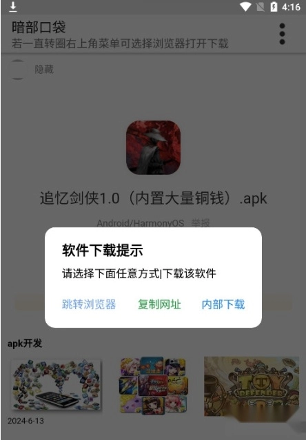 3、点击如果出现一直转圈的情况,就打开右上角三点进入浏览器;软件提示会推荐3种方式,分别是跳转浏览器、复制网址以及内部,哪种方式都可以。